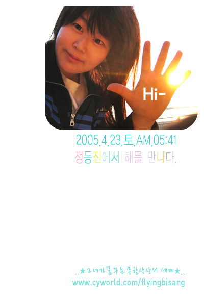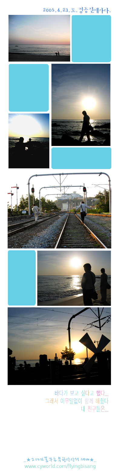 앗~ 정동진에서 찍은 사진이랑 비상이님 이름사진이랑 다르다 ㅋㅋㅋ 저것이 진정한 얼짱각도? ㅋㅋ 정동진 한번도 못가봤는데 사진으로만 봐조 좋네요^^
