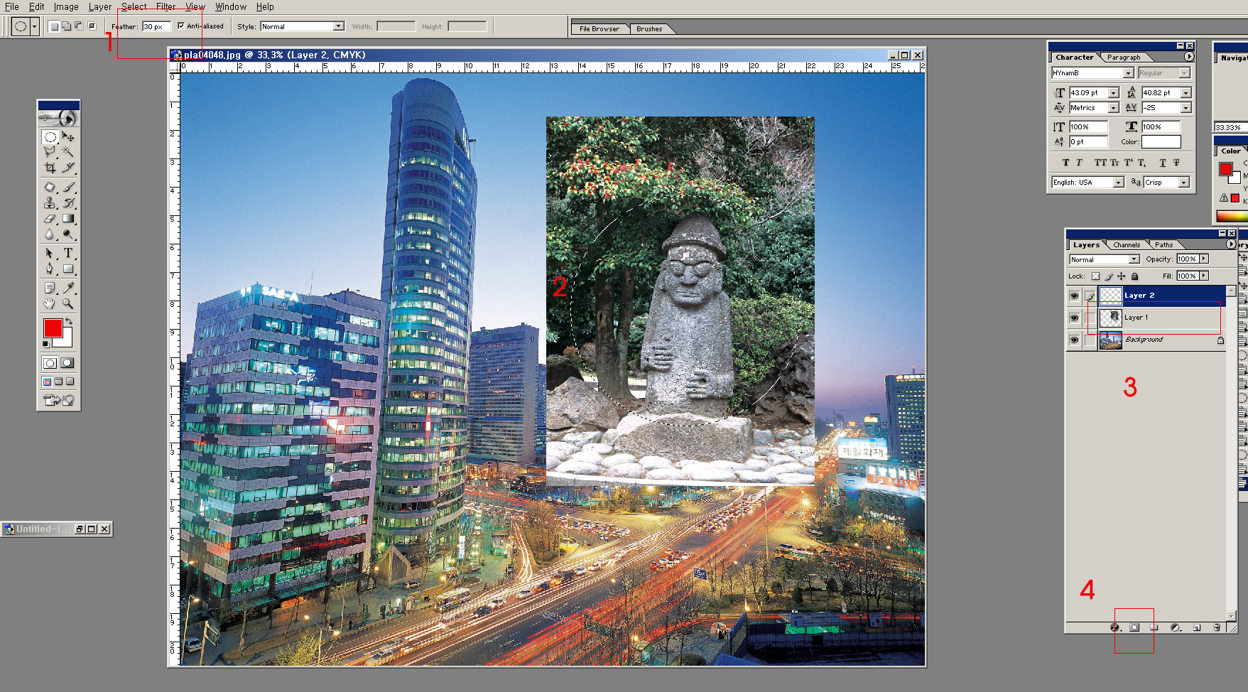 1. 먼저 선택툴을 선택하시고 상단에 Feather 값을 줍니다 저는 일단 30정도로 했구요 상태 보시고 적용하시면되요.